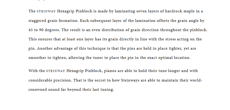 Steinway loves to highlight its Hexagrip pinblock—a laminated, staggered-grain design intended to grip tuning pins securely. Steinway’s own descriptions of the construction are straightforward and accurate. Steinway & Sons